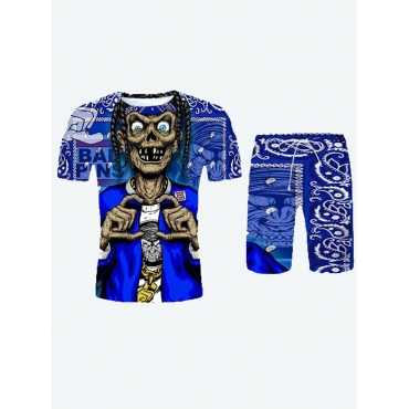 Lovely Casual Graffiti Print Blue Men Two Piece Shorts Set