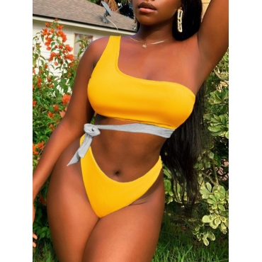 Lovely Casual One Shoulder Bandage Design Yellow Tankini