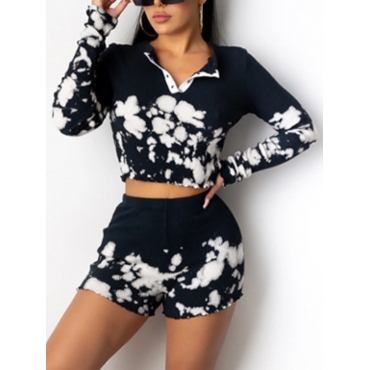 Lovely Casual Turndown Collar Print Black Two Piece Shorts Set