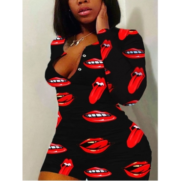 Lovely Casual Lip Print Black Plus Size One-piece Romper