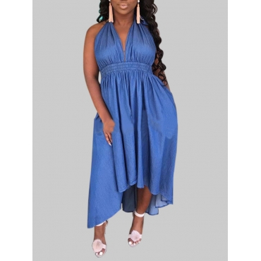 Lovely Casual V Neck Backless Blue Floor Length Denim Dress