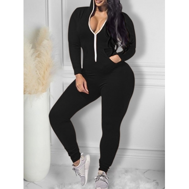 Lovely Casual Hooded Collar Zipper Design Black Plus Size One-piece Jumpsuit