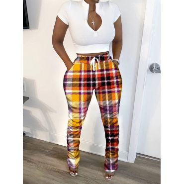 Lovely Stylish Zipper Design Grid Print Deep Yellow Two Piece Pants Set