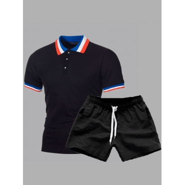 Lovely Casual Turndown Collar Patchwork Drawstring Black Men Two Piece Shorts Set