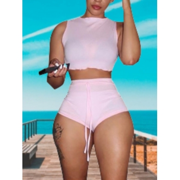 Lovely Casual High-waisted Drawstring Pink Tankini