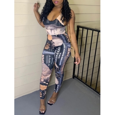Lovely Street U Neck Letter Print Patchwork Black One-piece Jumpsuit