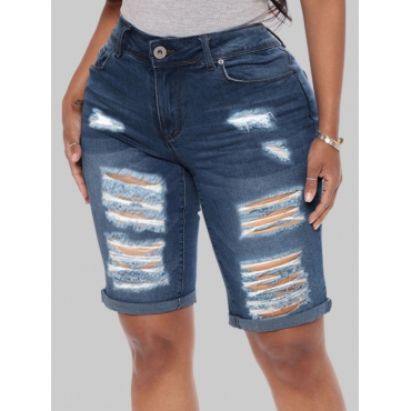 Lovely Casual Mid Waist Broken Holes Deep Blue Plus Size Denim Shorts
