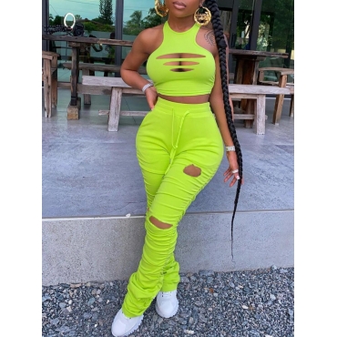 Lovely Street Broken Holes Fold Design Green Two Piece Pants Set