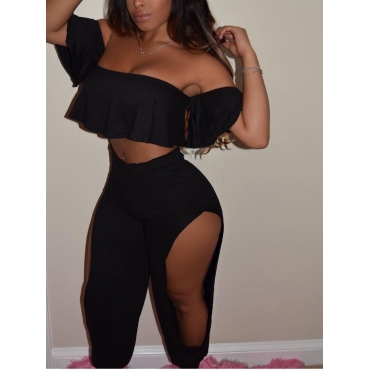 Lovely Sexy Flounce Design Hollow-out Black Two Piece Pants Set