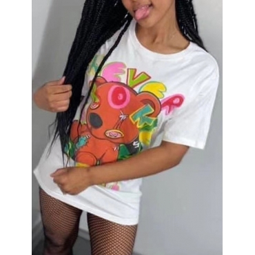 Lovely Casual O Neck Cartoon Print White T-shirt