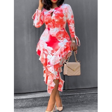 Lovely Stylish Print Flounce Design Asymmetrical Red Mid Calf Plus Size Dress