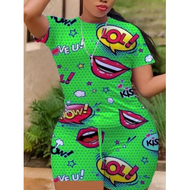 Lovely Leisure O Neck Lip Print Green Two Piece Shorts Set
