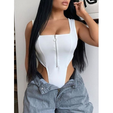 Lovely Casual Square Neck Zipper Design White Bodysuit