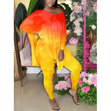 Lovely Stylish V Neck Tie-dye Split Orange Plus Size Two-piece Pants Set