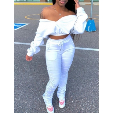 Lovely Trendy Dew Shoulder Fold Design White Two Piece Pants Set