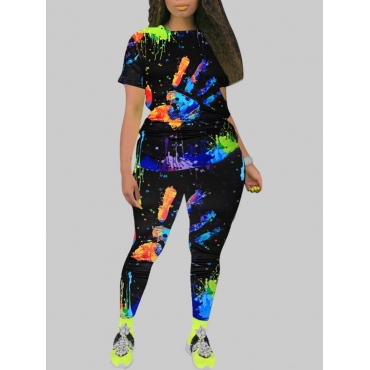 Lovely Street O Neck Graffiti Print Black Plus Size Two-piece Pants Set