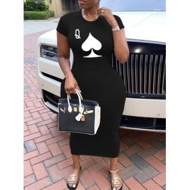 Lovely Casual O Neck Print Black Mid Calf Plus Size Dress