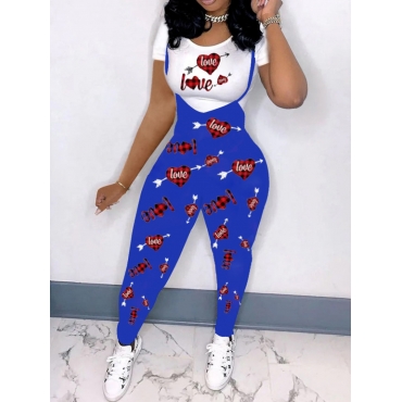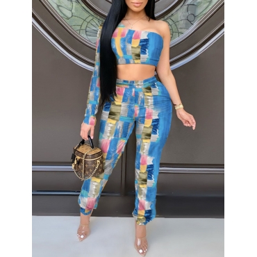 Lovely Sweet One Shoulder Print Patchwork Blue Two Piece Pants Set