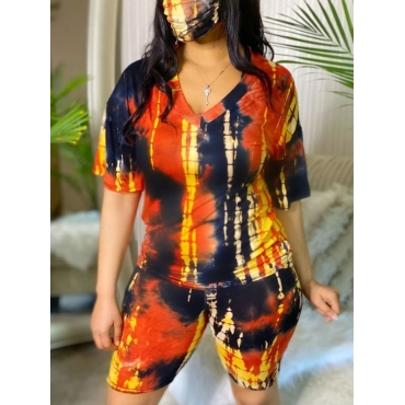 Lovely Casual V Neck Tie Dye Orange Two Piece Shorts Set