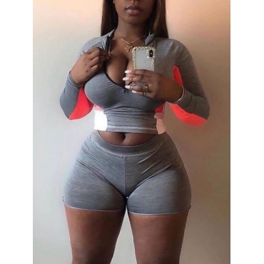 Lovely Sportswear V Neck Color-lump Grey Two Piece Shorts Set