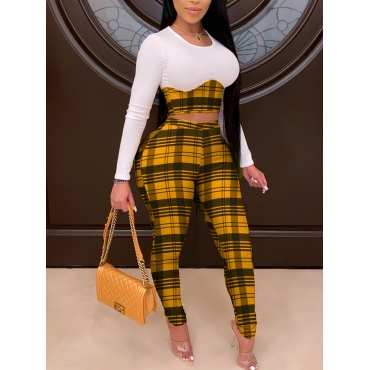 Lovely Casual U Neck Plaid Print Patchwork Yellow Two Piece Pants Set