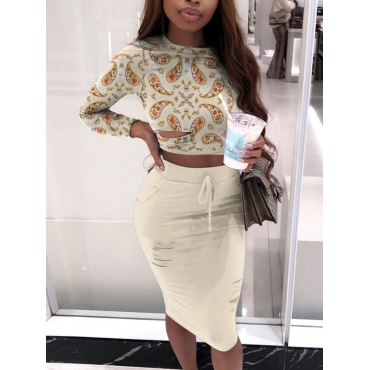 Lovely Casual Paisley Print Ripped Beige Two Piece Skirt Set