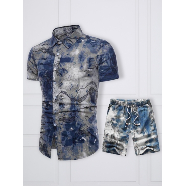 Lovely Casual Splash Ink Print Blue Men Two Piece Shorts Set