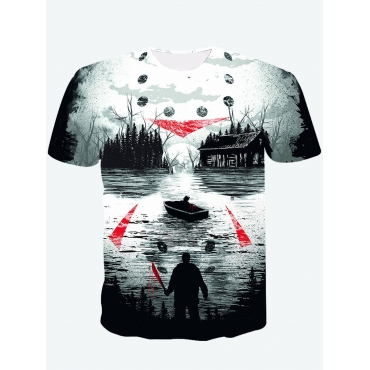 Lovely Casual O Neck Village River Print Black Men T-shirt