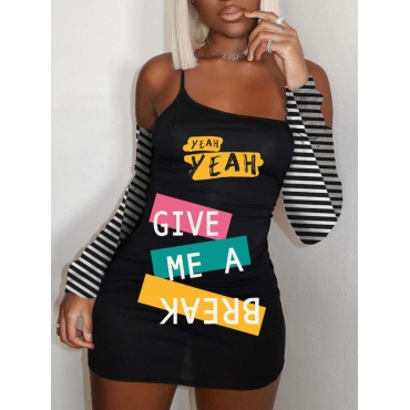 Lovely Trendy Off The Shoulder Letter Print Striped Black Mini Dress
