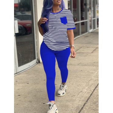 Lovely Casual O Neck Striped Patchwork Blue Two Piece Pants Set
