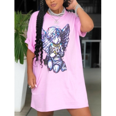 Lovely Casual O Neck Cartoon Print Pink Knee Length Dress