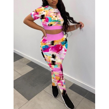 Lovely Casual Splash Ink Print Patchwork Pink Two Piece Pants Set