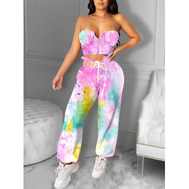Lovely Casual Off The Shoulder Tie-dye Drawstring Multicolor Two-piece Pants Set (No-positioning Printing)