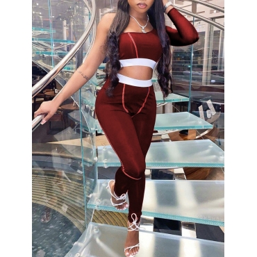 Lovely Sportswear One Shoulder Striped Purplish Red Two Piece Pants Set