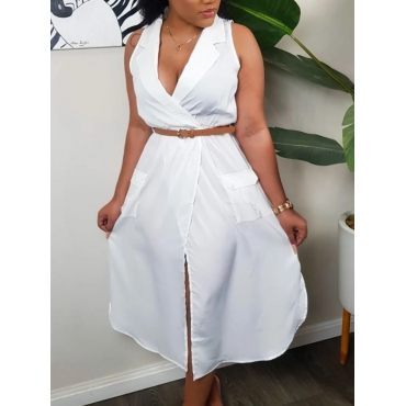 Lovely Casual Cross-over Pocket Design White Mid Calf Dress