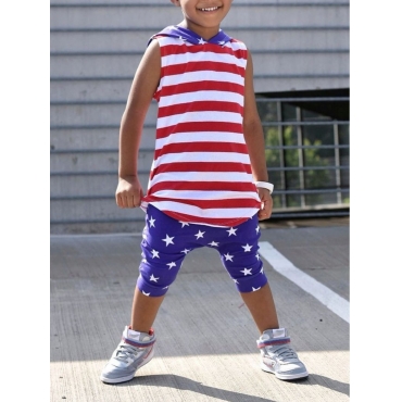 Lovely Casual Hooded Collar Star Print Striped Red Boy Two Piece Shorts Set