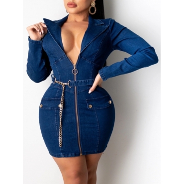 Lovely Sweet Turndown Collar Metal Accessories Decoration Blue Mini Denim Dress