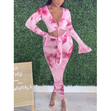 Lovely Sexy Flared Tie Dye Bandage Design Pink Two Piece Pants Set