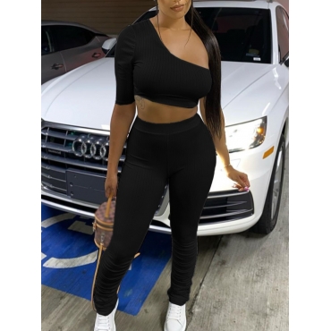 Lovely Chic One Shoulder Fold Design Black Two Piece Pants Set