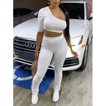 Lovely Chic One Shoulder Fold Design White Two Piece Pants Set