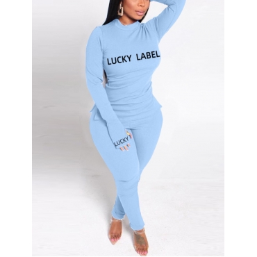 Lovely Trendy Letter Print Side Slit Blue Plus Size Two-piece Pants Set
