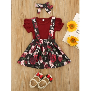 Lovely Sweet Flounce Design Floral Print Wine Red Girl Two Piece Skirt Set(With Headband)