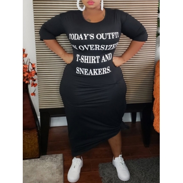 Lovely Casual O Neck Letter Print Black Ankle Length Plus Size Dress