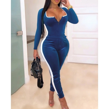 Lovely Sportswear Patchwork Zipper Design Blue One-piece Jumpsuit