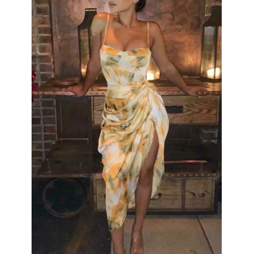 Lovely Sexy Print Ruched Asymmetrical White Mid Calf Evening Dress