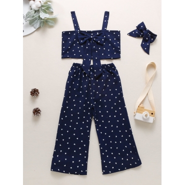 Lovely Sweet Heart-shaped Print Knot Design Dark Blue Girl Two Piece Pants Set