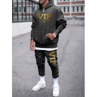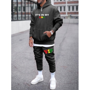 Lovely Casual Hooded Collar Letter Print Black Men Two Piece Pants Set