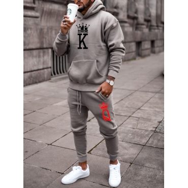 Lovely Casual Crown Letter Print Kangaroo Pocket Grey Men Two Piece Pants Set