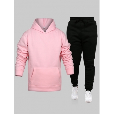 Lovely Casual Hooded Collar Kangaroo Pocket Pink Men Two Piece Pants Set