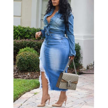 Lovely Casual Raw Edge Asymmetrical Blue Plus Size Denim Skirt